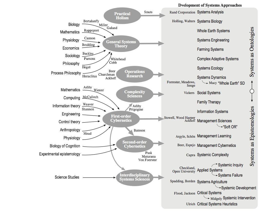 I worked with Ray Ison as he wrote and published his recent book Systems Practice: How to Act in a Climate-Changed World” (Springer, 2010). One of the interesting tasks Ray undertook is the creating a graphic overview of the development of systems approaches. You will notice that they are vertically arrayed with ontologies on top (studies about what “is”) and epistemologies (how we know what we know) below. This array is not strict, as many methods have a mixed or ambiguous perspective. Hence this is a loose set of categories.