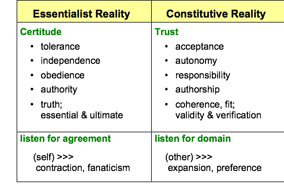 In the following table I have created a series of distinctions, as people often do in tables; where somewhat parallel ideas appear entirely different depending on which ontology and its attendant Reality or realities one accepts.