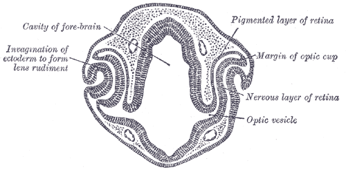 I talked about how the neural tube creates swellings that trigger a lens which in turn triggers the eye to form. Here is a drawing of a cross section of this development. It is a typical example of what is spoken of as “induction” in the development field... one thing induces another to happen; reciprocally.