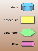 The stock flow diagram uses boxes for the stock, arrows for the flow, and taps for the regulators. More substantive representations discriminate between procedures and parameters that more fully represent the dynamics; and flow rates are explicitly tracked. These types of images, used as a basis for simulation modelling, will not be covered here.