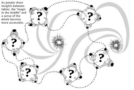 Another similar process is World Café which explicitly uses the metaphor of sitting and talking in a café where people feel at ease. World Café was co-developed by David Isaaks and Juanita Brown, who subsequently wrote a PhD thesis on this approach, incorporating Maturana’s ideas on conversation into the framework..