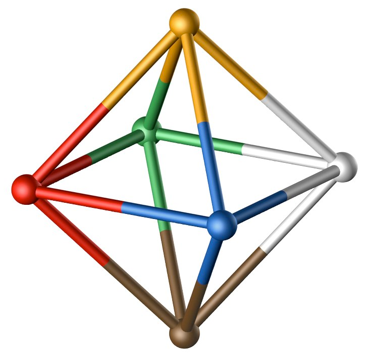 The original version was designed on the basis of an icosahedron, pictured above. It is designed to enable the equal participation of 30 people (the bicolored struts) in discussions concerning a complex idea or “opening questions” that these same participants elucidate and then group into 12 subtopics (the nodes). Each person has a primary role with two topics, and a critic role with two others. Further, they are in an observer role with yet another two topics. The octahedron form is intended for smaller groups; a dozen people discussing a complex idea divided into 6 different topics.